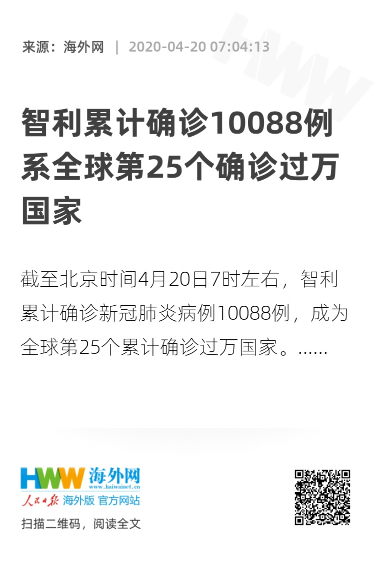 【海外网4月20日|战疫全时区】根据美国约翰斯·霍普金斯大学新冠肺炎疫情统计数据显示,截至北京时间4月20日7时左右,智利累计确诊新冠肺炎病例10088例,死亡病例133例,成为全球第25个累计确诊过万国家。