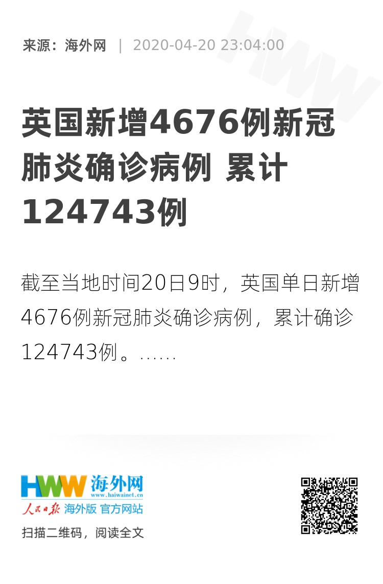 【海外网4月20日|战疫全时区】英国卫生部网站发布的最新消息显示,截至当地时间20日9时,英国单日新增4676例新冠肺炎确诊病例,累计确诊124743例;新增死亡病例449例,累计死亡病例升至16509例。(海外网 赵健行)