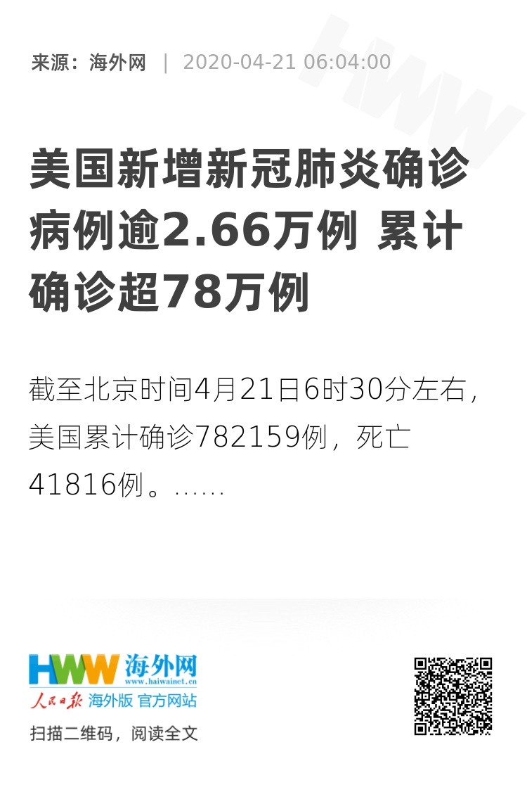 【海外网4月21日|战疫全时区】截至北京时间4月21日6时30分左右,美国累计确诊782159例,死亡41816例。与前一天6时30分数据相比,美国新增确诊病例26626例,新增死亡1355例。