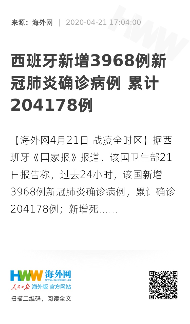 【海外网4月21日|战疫全时区】据西班牙《国家报》报道,该国卫生部21日报告称,过去24小时,该国新增3968例新冠肺炎确诊病例,累计确诊204178例;新增死亡病例430例,累计死亡21282例,还有82514人康复。该国是全球第2个确诊病例数超20万的国家。