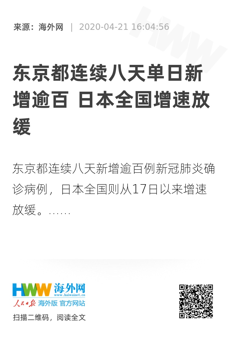 【海外网4月21日|战疫全时区】据日本放送协会21日报道,东京都当天报告新增123例新冠肺炎确诊病例,连续第八天新增超百例,累计确诊3307例。东京都单日新增病例数17日首次超过200例后增速放缓,18日新增181例,19日新增107例,20日新增102例。