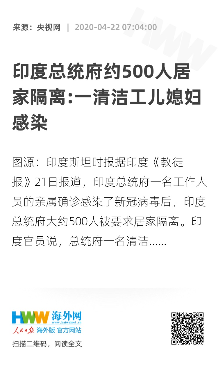 据印度《教徒报》21日报道,印度总统府一名工作人员的亲属确诊感染了新冠病毒后,印度总统府大约500人被要求居家隔离。
