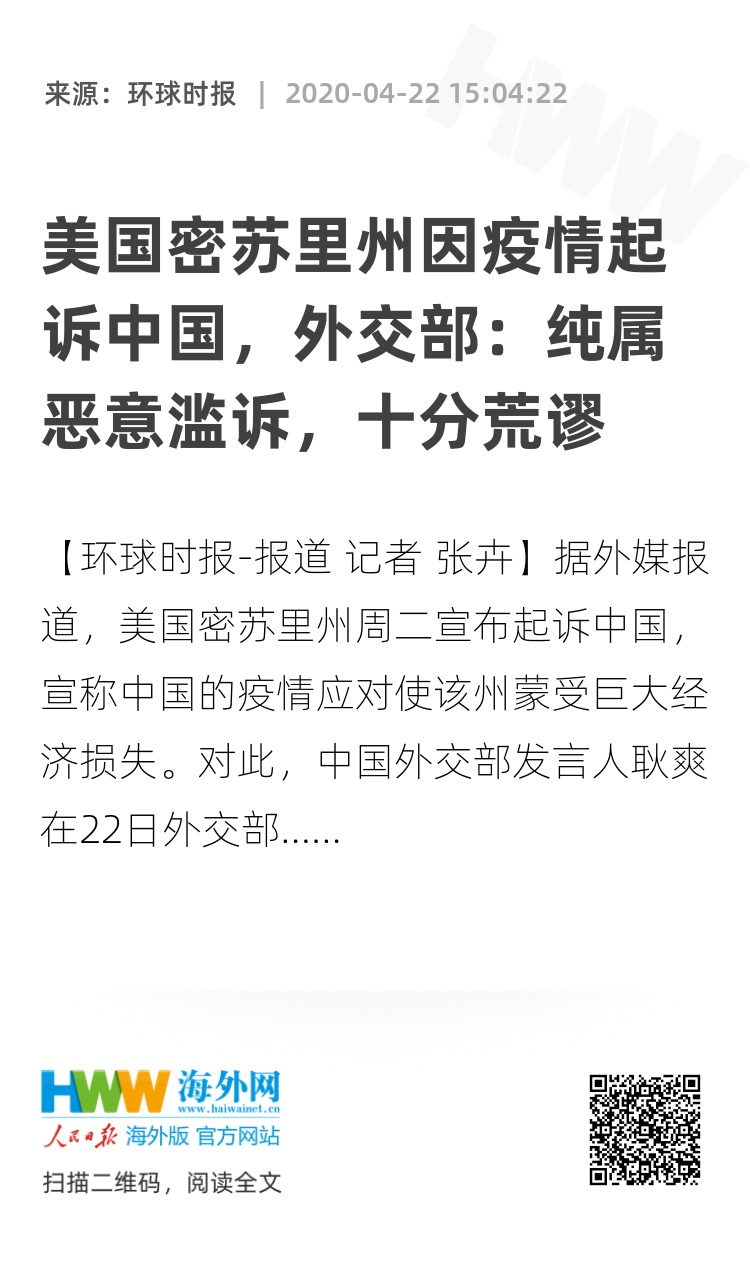【环球时报-环球网报道 记者 张卉】据外媒报道,美国密苏里州周二宣布起诉中国,宣称中国的疫情应对使该州蒙受巨大经济损失。对此,中国外交部发言人耿爽在22日外交部例行记者会上表示,这种所谓的控告毫无事实和法律依据,十分荒谬。