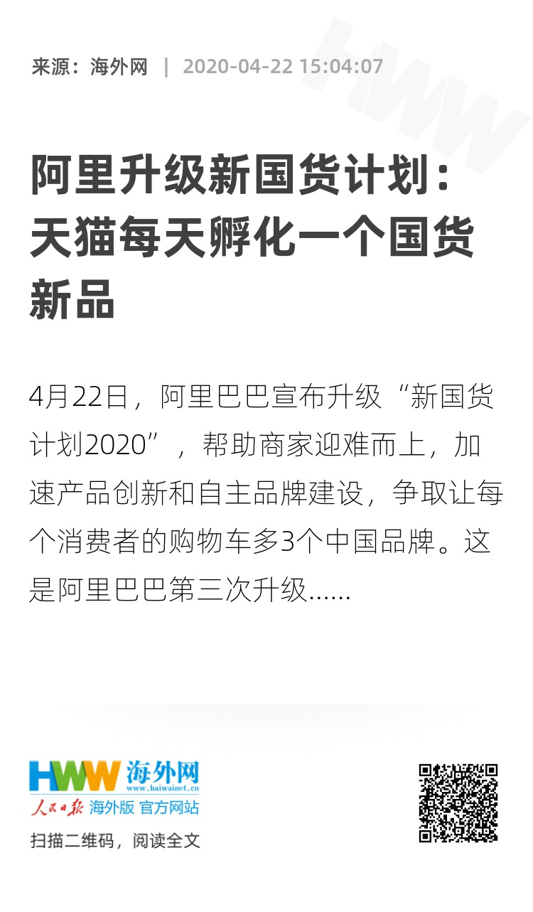 4月22日,阿里巴巴宣布升级“新国货计划2020”,帮助商家迎难而上,加速产品创新和自主品牌建设,争取让每个消费者的购物车多3个中国品牌。
