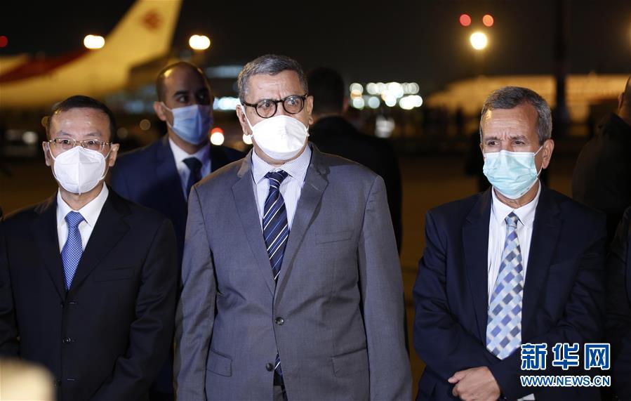 4月21日,阿尔及利亚总理杰拉德(中)在阿尔及尔国际机场迎接运送医疗物资的飞机。 中国援助阿尔及利亚的新一批医疗物资21日晚运抵阿尔及尔国际机场,阿尔及利亚总理杰拉德及部分政府工作人员到机场迎接。这批物资近20吨,包括医用口罩、核酸检测试剂盒、呼吸机等。 新华社发