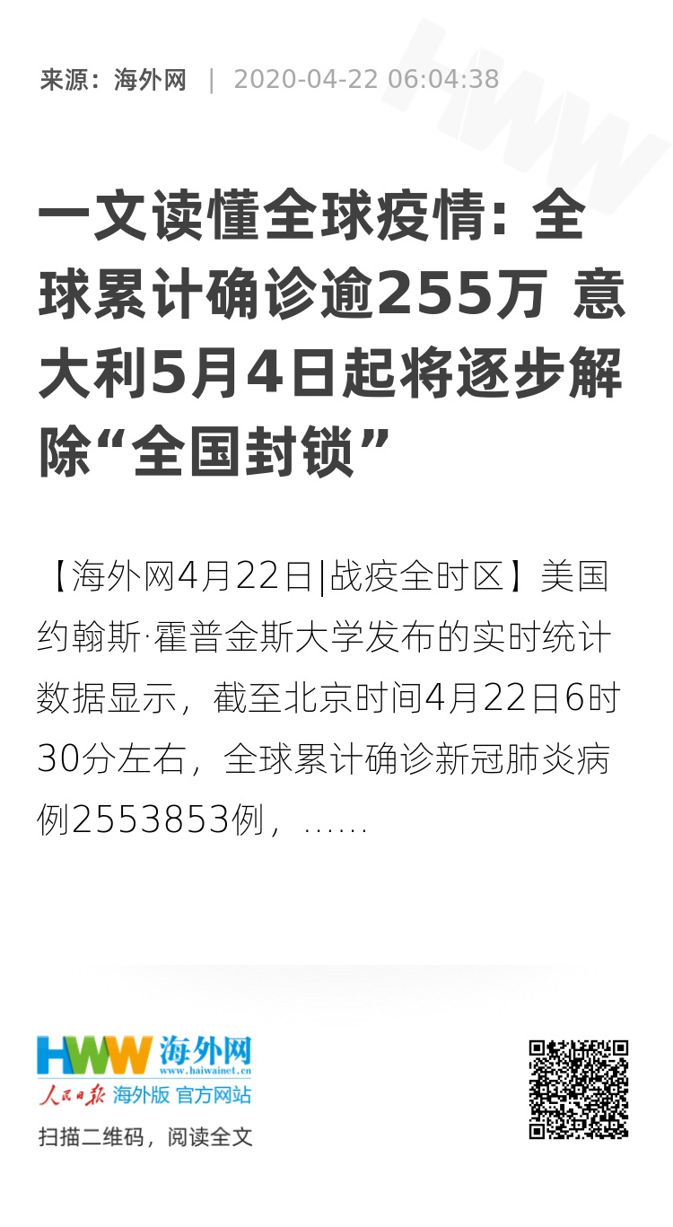 【海外网4月22日|战疫全时区】美国约翰斯·霍普金斯大学发布的实时统计数据显示,截至北京时间4月22日6时30分左右,全球累计确诊新冠肺炎病例2553853例,累计死亡176323例。