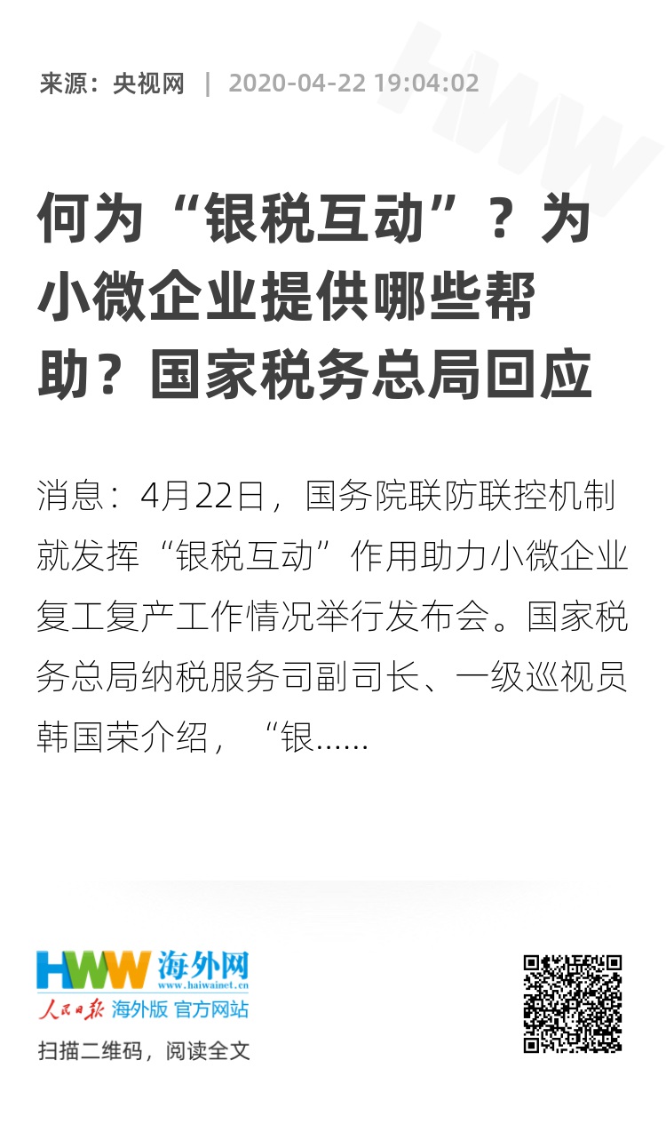 央视网消息:4月22日,国务院联防联控机制就发挥“银税互动”作用助力小微企业复工复产工作情况举行发布会。