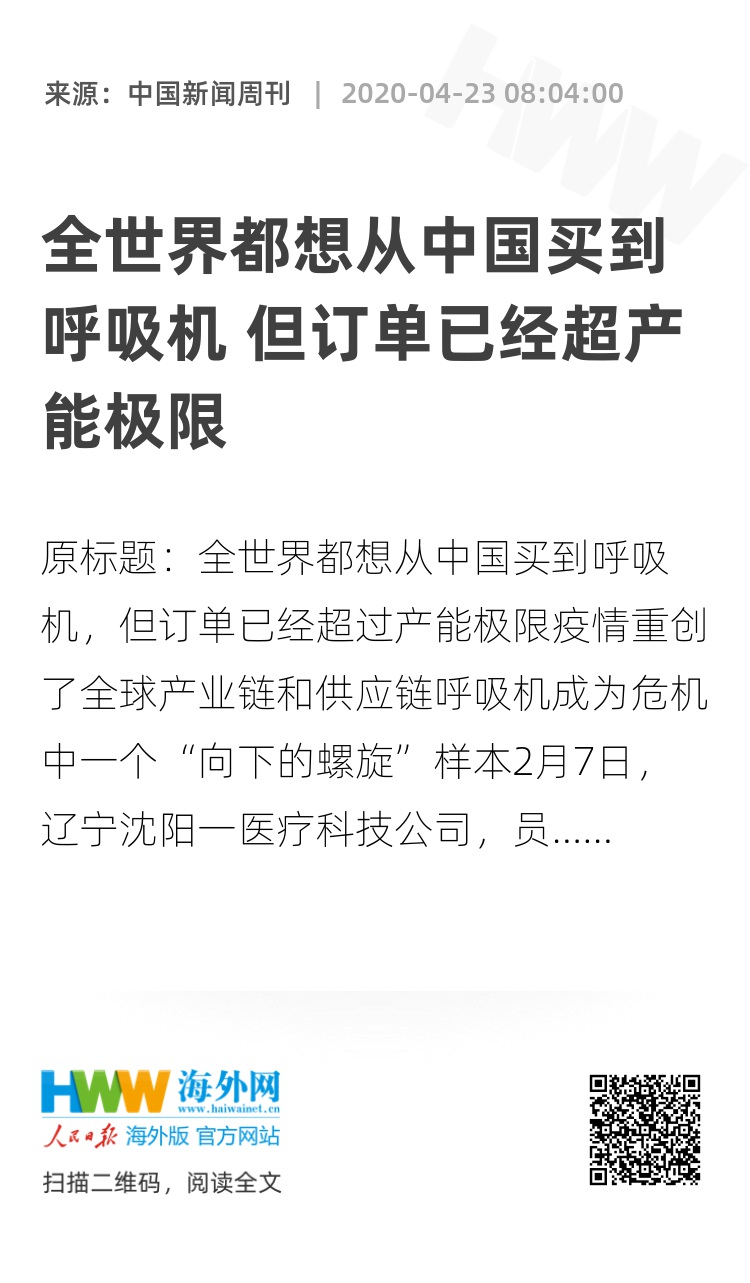 “世界上没有一个国家不想立即从中国买到呼吸机。”谊安医疗公司董事长助理李凯表示。此前,中国在高端呼吸机领域所占市场份额很低,但因国内产能恢复,接到了无数海外订单,生产排期已至9月。