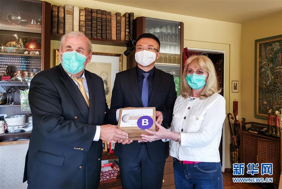4月21日,在德国西南部城市海德堡,托马斯·拉贝(左)与夫人接受中国捐赠的防疫物资。 新华社发(中国驻德国大使馆供图)