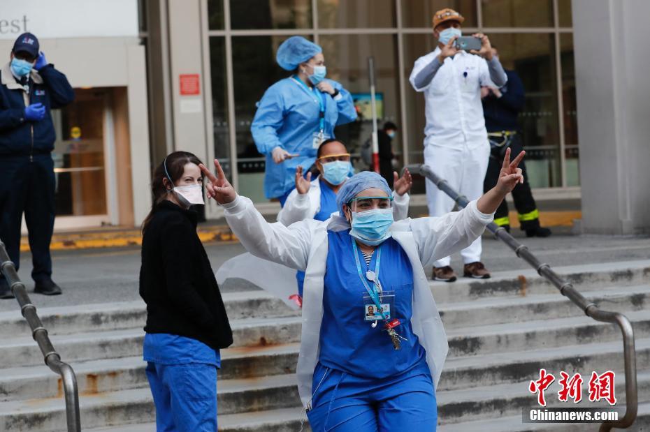 当地时间4月22日晚7时,纽约社会各界人士在西奈山西区医院门前鼓掌感谢抗击新冠肺炎的医务工作者。近来,每晚7时纽约市各所收治新冠肺炎病患的定点医院周围都会响起感谢医务工作者的掌声。中新社记者 廖攀 摄