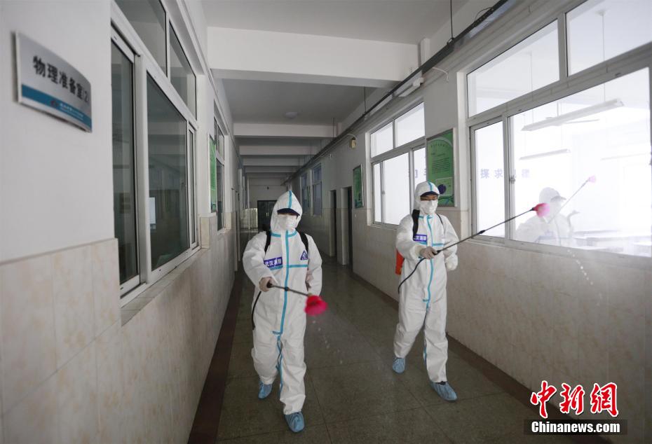 湖北省新冠肺炎疫情防控工作指挥部4月20日发布通告,全省普通高中毕业年级(含中职学校和技工学校的毕业年级)学生5月6日统一开学。4月22日,湖北武汉、黄冈等地高三年级全面开展消杀作业。当日,近30名消防员分别深入多所中学,对学校教学楼、实验楼、宿舍楼、食堂及公共区域进行了全面消杀。王方 摄