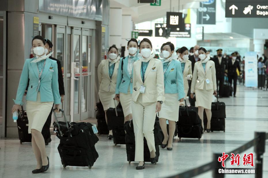 当地时间4月22日,加拿大多伦多皮尔逊国际机场,一家亚洲航空公司的机组成员全体佩戴口罩,准备登机。中新社记者 余瑞冬 摄