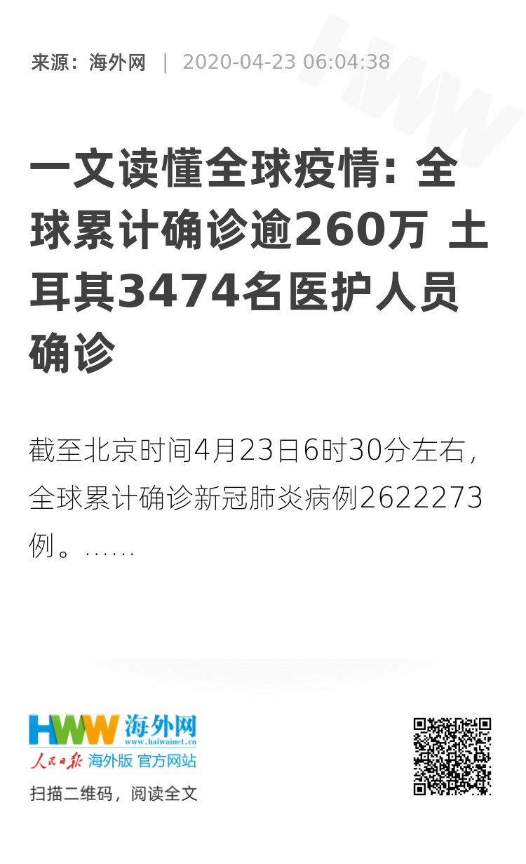 【海外网4月23日|战疫全时区】美国约翰斯·霍普金斯大学发布的实时统计数据显示,截至北京时间4月23日6时30分左右,全球累计确诊新冠肺炎病例2622273例,累计死亡182943例。