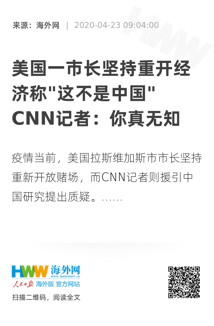 【海外网4月23日|战疫全时区】当地时间22日,美国拉斯维加斯市市长卡罗琳·古德曼(Carolyn Goodman)接受CNN连线,与记者安德森·库珀探讨了一系列关于新冠肺炎疫情的话题。期间,古德曼坚称要重新开放经济,而CNN记者则援引中国研究提出质疑。