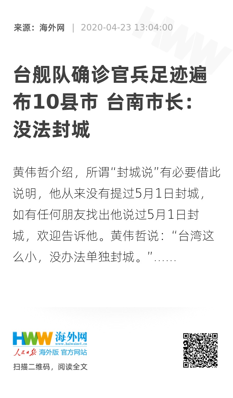 【海外网4月23日综合报道】台海军海军“敦睦舰队”暴发群聚感染,确诊官兵下船足迹遍及岛内10县市,引起社会恐慌。有台媒报道,台南市长黄伟哲曾表示,五一连假若疫情无法控制,就该封城处理。而4月23日黄伟哲接受采访时否认,重申从来没有说过5月1日封城。