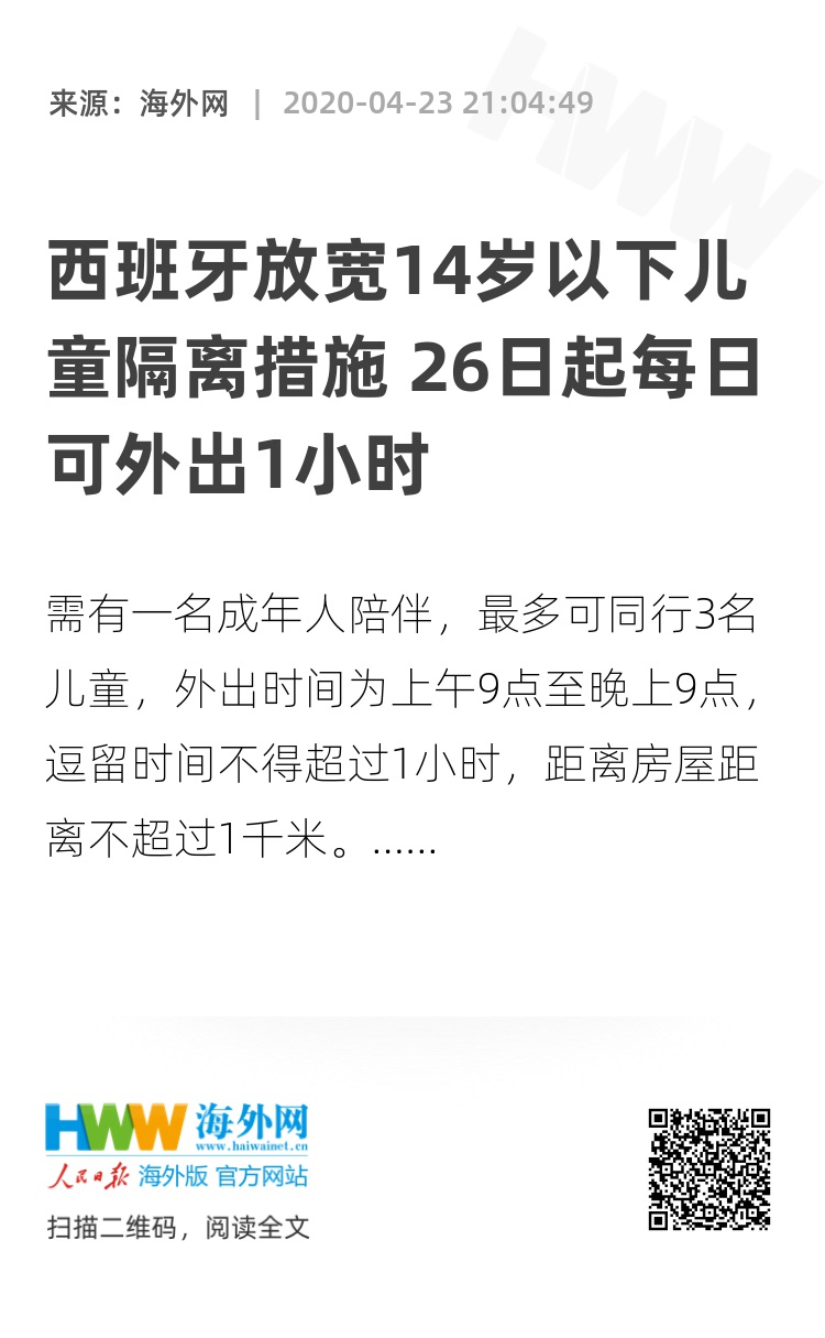 【海外网4月23日|战疫全时区】西班牙政府当地时间23日宣布,从4月26日起放宽对14岁以下儿童的隔离措施,要求是需有一名成年人陪伴,最多可同行3名儿童,外出时间为上午9点至晚上9点,逗留时间不得超过1小时,距离房屋距离不超过1千米。