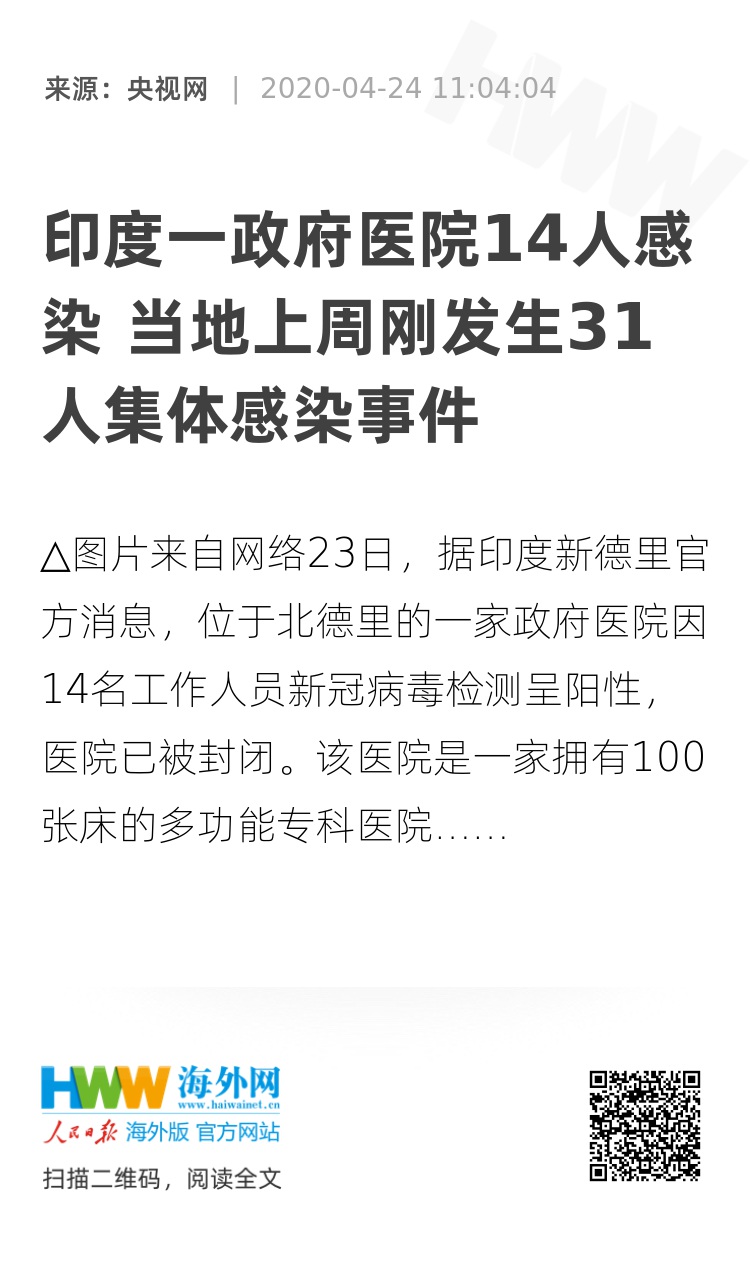 该医院是一家拥有100张床的多功能专科医院。医院所在的Jahangirpuri地区已经是新德里疫情的重点地区之一,此前已经被严密监控和封锁。24日当天,该地区还发现了46名确诊病例。此前一周,该地区曾发生过一起特大家庭31人集体染病的事件。