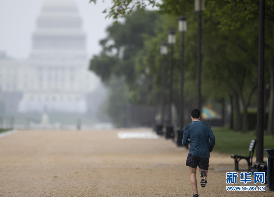4月23日,在美国华盛顿,一名男子在国家广场跑步。 美国国会众议院23日投票通过一项总额约4840亿美元的援助法案,以增加对小企业贷款项目、医院和新冠病毒检测机构的拨款。该法案将交由美国总统特朗普签署成为法律。 新华社发(沈霆摄)