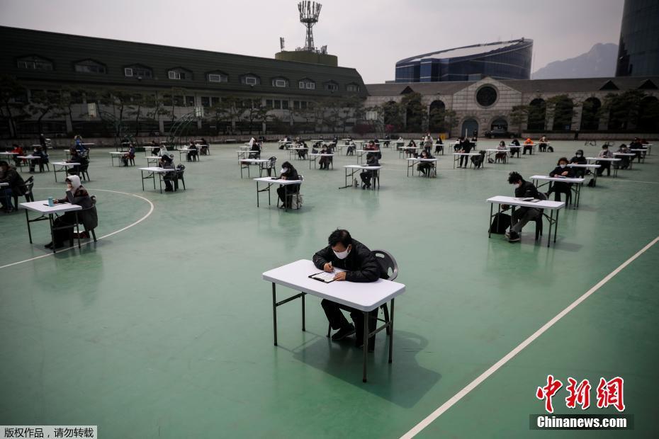 当地时间4月25日,韩国为了避免新型冠状病毒传播,在露天操场为求职者举行入职考试。