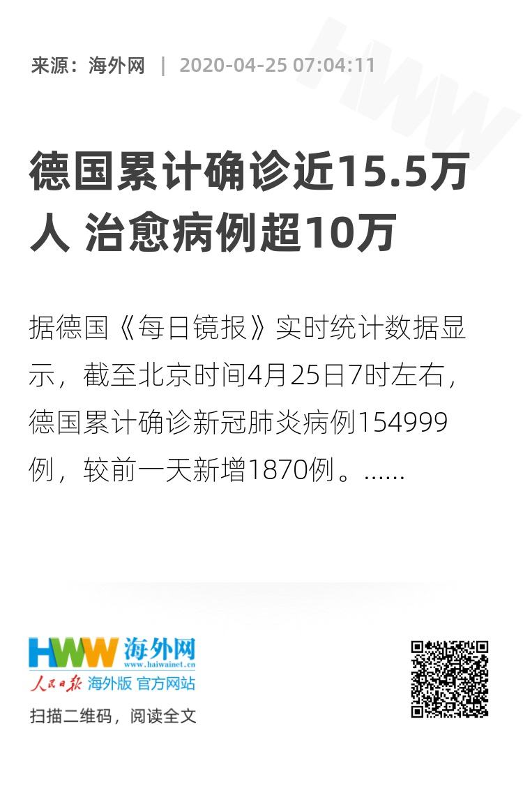 【海外网4月25日|战疫全时区】据德国《每日镜报》实时统计数据显示,截至北京时间4月25日7时左右,德国累计确诊新冠肺炎病例154999例,较前一天新增1870例;累计死亡5760,较前一天新增445例;累计治愈超过103300人。(海外网 张琪)