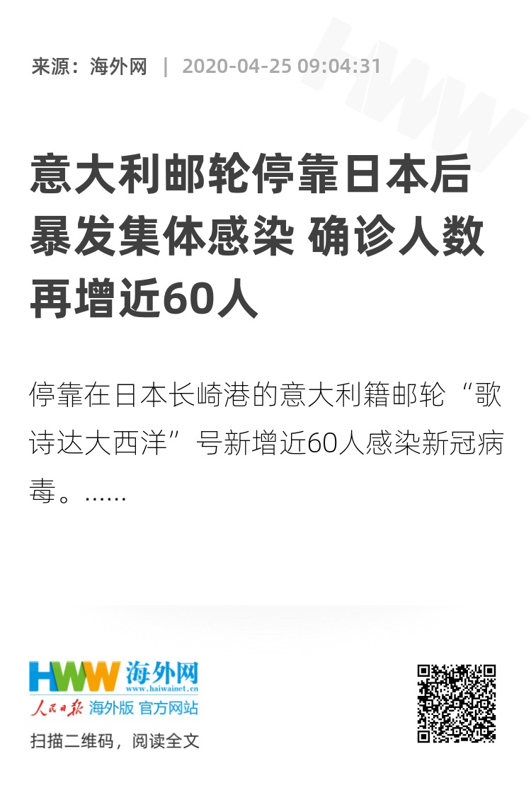 【海外网4月25日|战疫全时区】据日本NHK电视台25日报道,停靠在日本长崎港的意大利籍邮轮“歌诗达大西洋”号新增近60人感染新冠病毒。