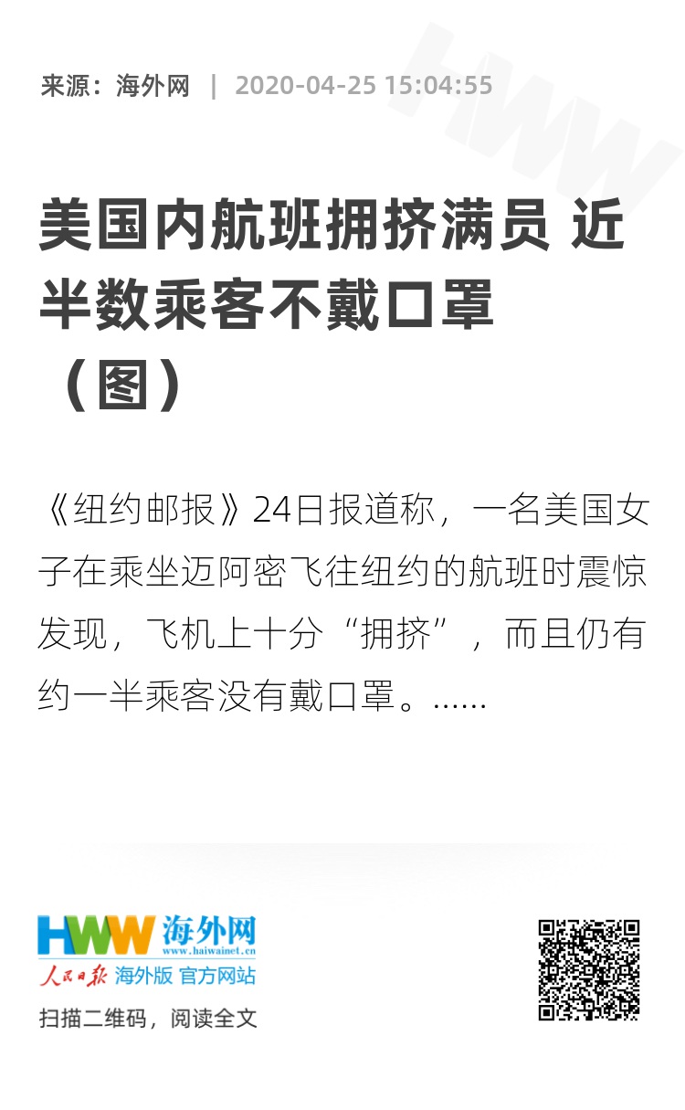 【海外网4月25日|战疫全时区】《纽约邮报》24日报道称,一名美国女子在乘坐迈阿密飞往纽约的航班时震惊发现,飞机上十分“拥挤”,而且仍有约一半乘客没有戴口罩。
