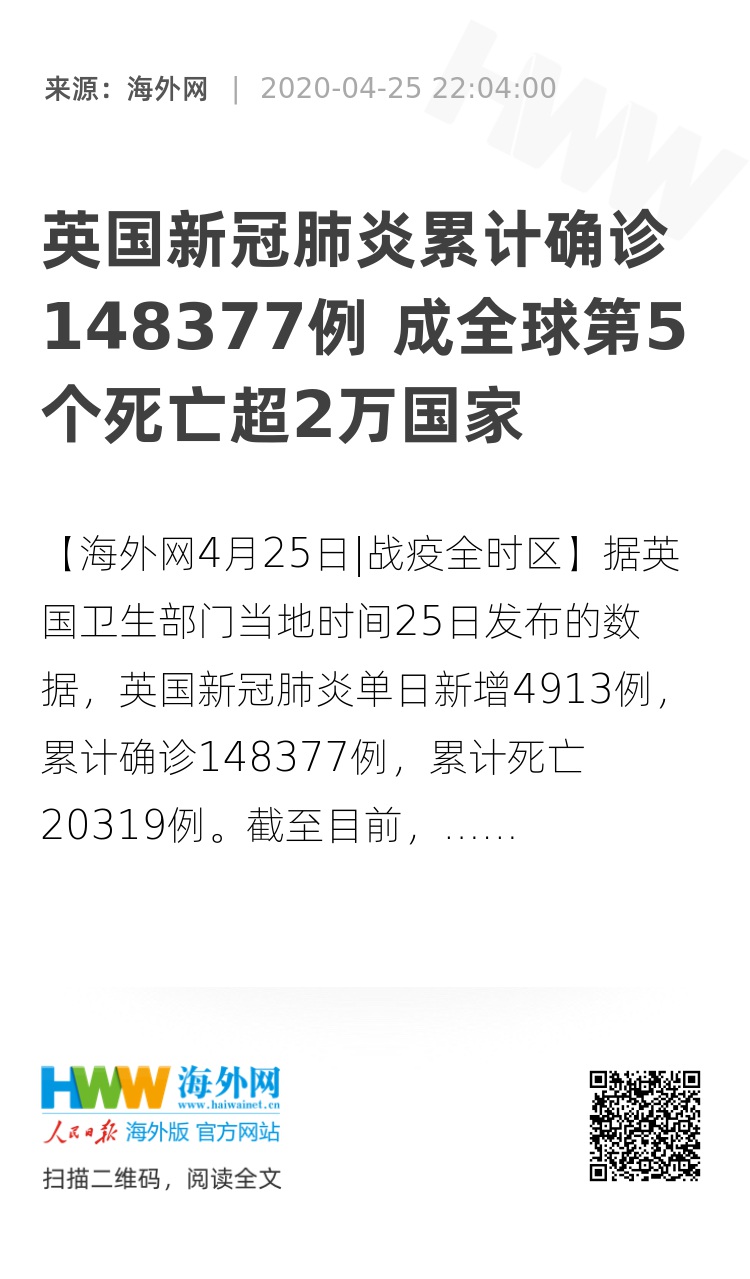 【海外网4月25日|战疫全时区】据英国卫生部门当地时间25日发布的数据,英国新冠肺炎单日新增4913例,累计确诊148377例,累计死亡20319例。截至目前,英国已成为全球第五个死亡超2万的国家。