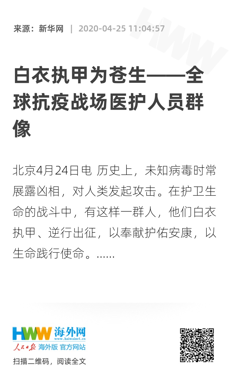 新华社北京4月24日电 历史上,未知病毒时常展露凶相,对人类发起攻击。在护卫生命的战斗中,有这样一群人,他们白衣执甲、逆行出征,以奉献护佑安康,以生命践行使命。