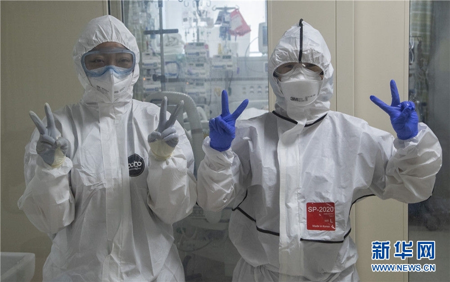 3月18日,在韩国大邱启明大学东山医院,医护人员对记者摆出胜利手势。新华社发(李相浩摄)