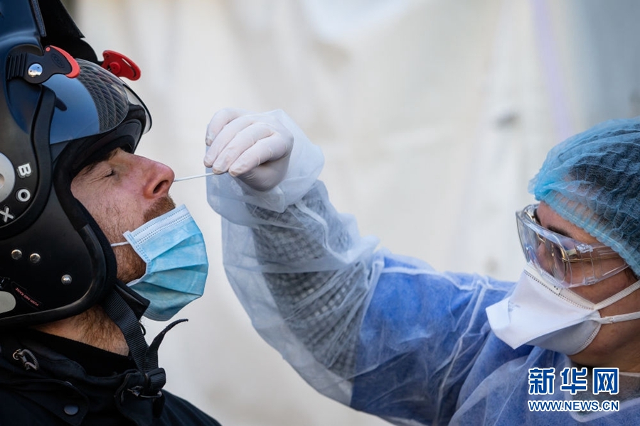 4月1日,在法国巴黎17区,工作人员为一名接受新冠病毒检测的医护人员取样。新华社发(奥雷利安·莫里萨尔摄)