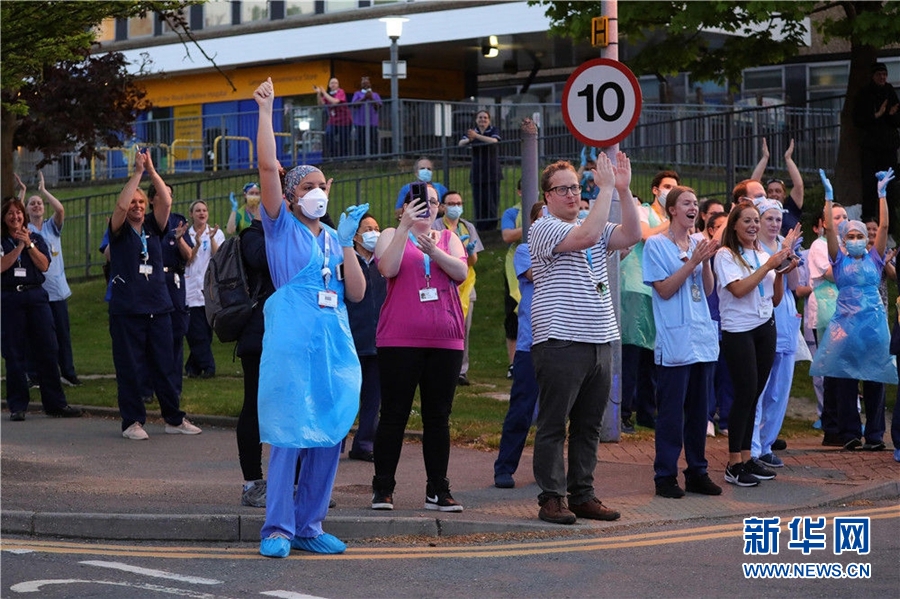 4月23日,在英国雷丁,皇家伯克郡医院的医护人员在医院外鼓掌。新冠疫情暴发以来,每周四晚八时,英国人在阳台、门前或窗前鼓掌,向医护人员致敬。部分医院的医护人员也忙里偷闲走出医院,感谢人们的支持,也为自己鼓掌加油。新华社发(蒂姆·爱尔兰摄)
