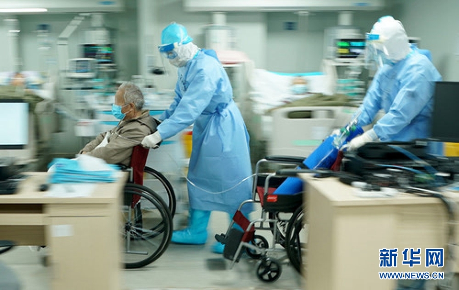 3月20日,武汉火神山医院重症医学一科副主任宋立强(中)护送81岁的新冠肺炎重症患者去做CT检查。为确保患者有充足供氧,医生胡世颉推着氧气瓶随行。新华社记者 王毓国 摄