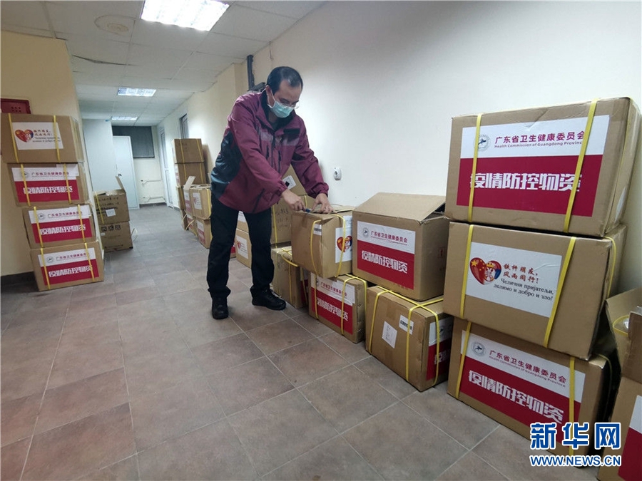 3月28日,在塞尔维亚首都贝尔格莱德的中国赴塞尔维亚抗疫医疗专家组驻地,专家组成员龙其穗整理清点物资,为第二天使用的防护用具做好准备。这是他每晚必做的工作。新华社发(专家组供图)
