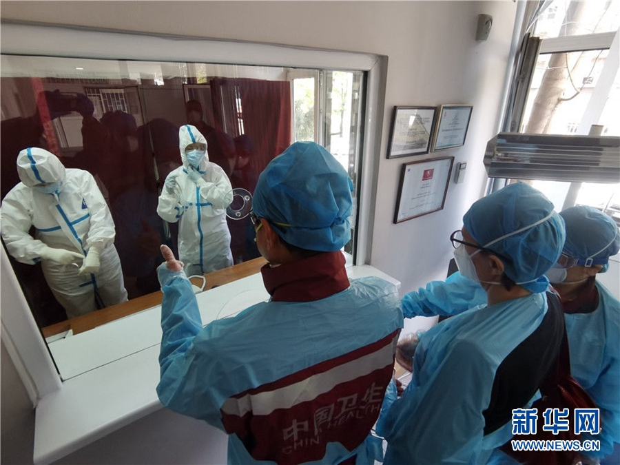 4月11日,在塞尔维亚首都贝尔格莱德,中国赴塞尔维亚抗疫医疗专家组在贝尔格莱德一所门诊走访,为医护人员的防护意识点赞。新华社发(中国赴塞尔维亚抗疫医疗专家组供图)