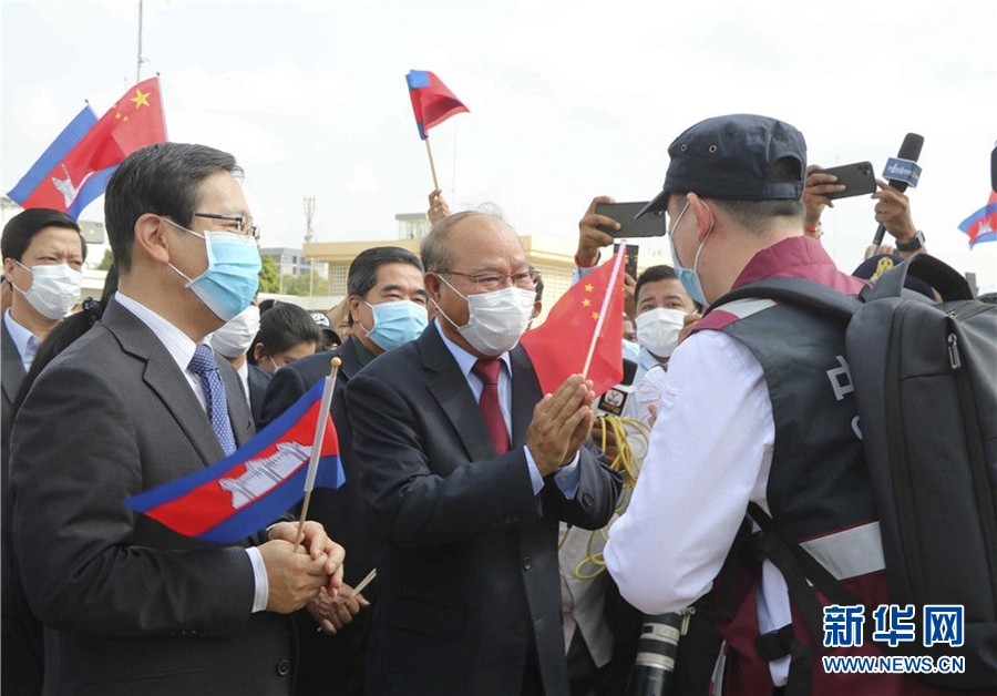 3月23日,在柬埔寨首都金边,柬埔寨卫生大臣曼本亨(中)在机场迎接中国抗疫医疗专家组。新华社记者 毛鹏飞 摄