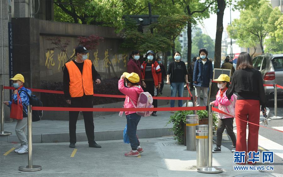 4月26日,在杭州市刀茅巷小学校门外,一年级学生排队入校。 当日,浙江多地小学一至三年级开学复课。 新华社发(龙巍 摄)