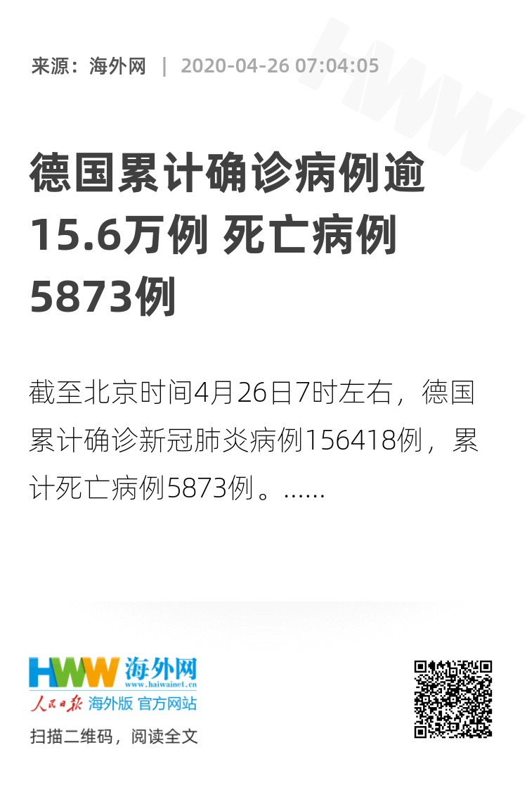 【海外网4月26日|战疫全时区】据德国《每日镜报》实时统计数据显示,截至北京时间4月26日7时左右,德国累计确诊新冠肺炎病例156418例,较前一天新增1419例;累计死亡病例5873例,较前一天新增113例;累计治愈超过103300人。