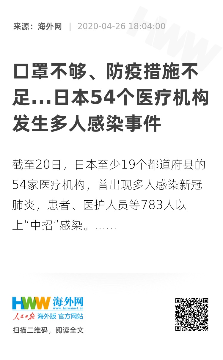 【海外网4月26日|战疫全时区】新冠肺炎疫情在日本持续蔓延,日本看护协会最新统计显示,截至本月(4月)20日,日本至少19个都道府县的54家医疗机构,曾出现多人感染新冠肺炎,患者、医护人员等783人以上“中招”感染。