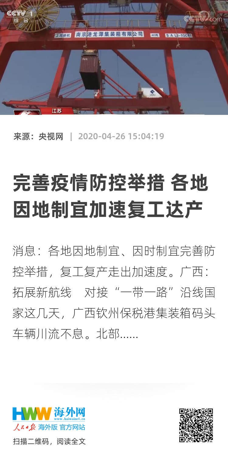 央视网消息:各地因地制宜、因时制宜完善防控举措,复工复产走出加速度。