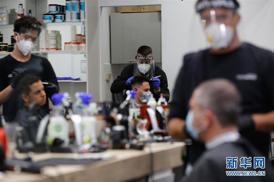 4月26日,在以色列中部城市莫迪因的一家理发店内,理发师在为客人理发。 从25日起,以色列的疫情限制措施进一步放松,允许所有街边的商店、理发店和美容店等重新开业,允许餐馆和咖啡馆提供外卖服务,但大型购物中心仍处于关闭状态。 新华社发(吉尔·科恩·马根 摄)