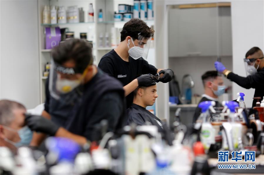 4月26日,在以色列中部城市莫迪因的一家理发店内,理发师在为客人理发。 从25日起,以色列的疫情限制措施进一步放松,允许所有街边的商店、理发店和美容店等重新开业,允许餐馆和咖啡馆提供外卖服务,但大型购物中心仍处于关闭状态。 新华社发(吉尔·科恩·马根 摄)