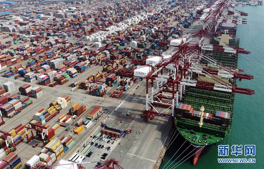 “现代商船阿尔赫西拉斯”轮靠泊在青岛港前湾码头(无人机照片,4月26日摄)。 当日,载箱量可达2.4万标准箱的世界最大集装箱船“现代商船阿尔赫西拉斯”轮从山东青岛港开启首航,这条船的甲板面积超过2.4万平方米,相当于3.5个标准足球场大小。 新华社记者 李紫恒 摄