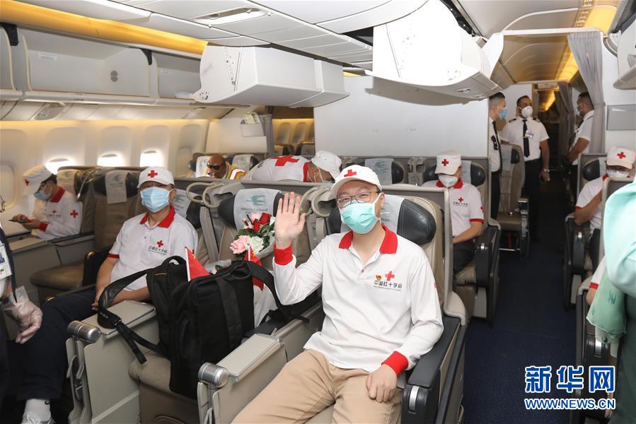 4月26日,在伊拉克巴格达国际机场,中国红十字会援助伊拉克专家组成员乘伊方包机启程回国。新华社发