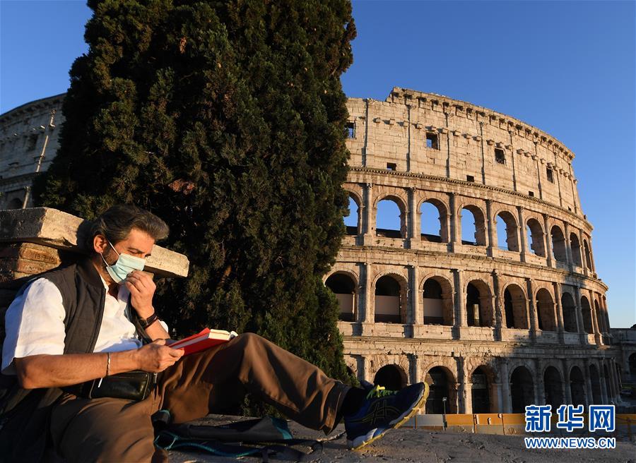 4月26日,一名戴着口罩的男子在意大利首都罗马的斗兽场附近看书。 意大利总理孔特26日表示,意大利将从5月4日开始逐步复工。 新华社发(埃丽萨·林格利亚 摄)