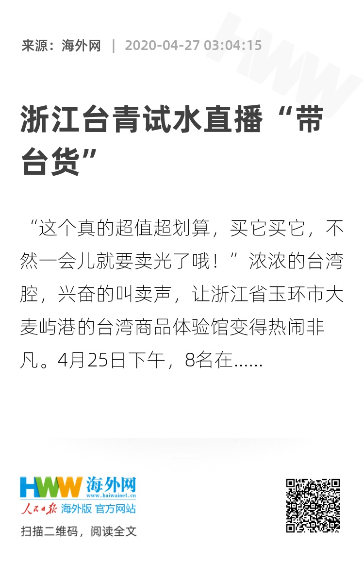 “直播带货是当前的商业潮流,许多不为人知的好东西、好产品,一夕之间就能变身卖断货的‘网红’。”杨苡苓表示,这次直播试水希望让“舌尖上的台湾”更多走进玉环的千家万户,再从玉环出发,走好在整个大陆新零售转型的第一程。“虽然我此前没有试过直播带货,但经常看大陆的直播,他们带货的时候描述很深入人心,让我莫名想拍下产品。我想只要能够展露自己的真性情,直播就会更自如。”