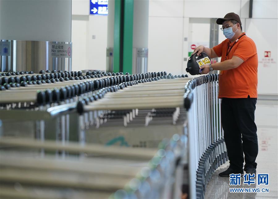 4月24日,工作人员在香港国际机场客运大楼旅客设施应用抗菌涂层。新华社发