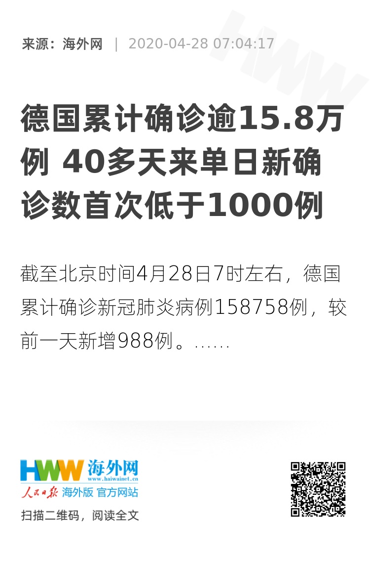 【海外网4月28日|战疫全时区】据德国《每日镜报》实时统计数据显示,截至北京时间4月28日7时左右,德国累计确诊新冠肺炎病例158758例,较前一天新增988例,单日新增确诊病例数系3月17日以来首次降至1000例以下;累计死亡病例6126例,较前一天新增150例;累计治愈112000人。