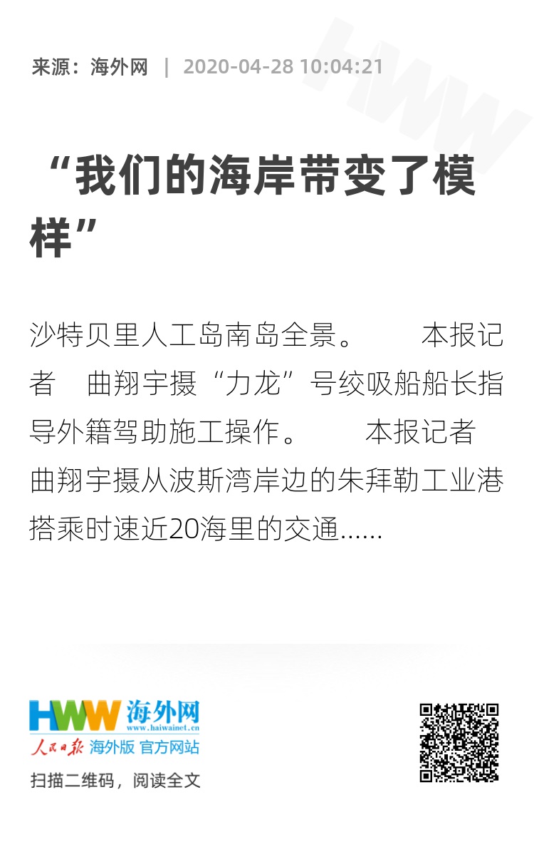 沙特国内多沙漠,填海造地成为沙特拓展发展空间的主要方式,贝里人工岛就是这一背景下的典型项目。疫情期间,中国企业在严格采取防控措施的同时,稳步推进施工建设,注重保护当地环境,赢得各方称赞。