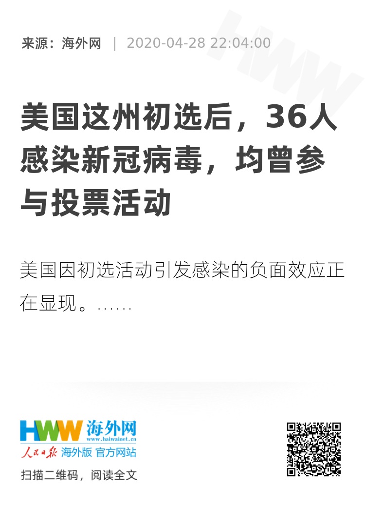 【海外网4月28日|战疫全时区】新冠肺炎疫情持续在美蔓延,正值选举年,因初选活动引发感染的负面效应正在显现。美国Politico27日报道称,截至当地时间27日,至少有36名曾参加过威斯康星州初选活动的人员感染新冠病毒。