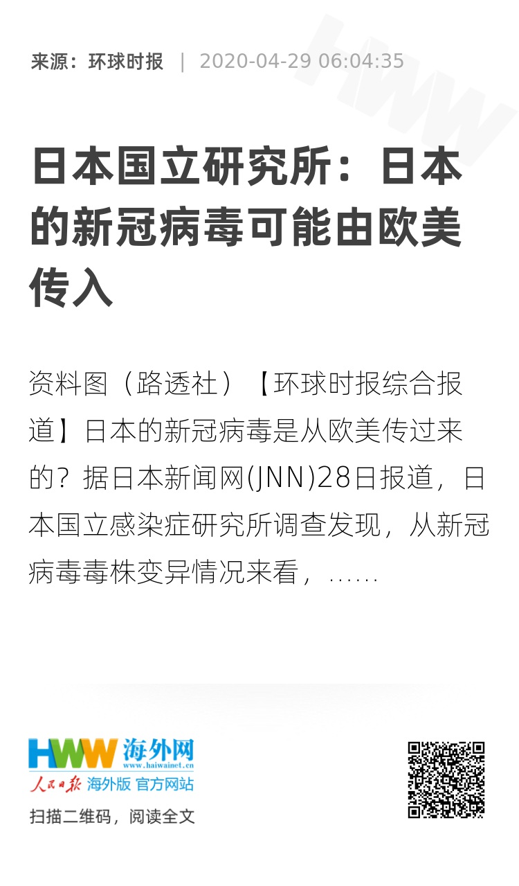 【环球时报综合报道】日本的新冠病毒是从欧美传过来的?据日本新闻网(JNN)28日报道,日本国立感染症研究所调查发现,从新冠病毒毒株变异情况来看,目前在日本蔓延的新冠病毒从欧美传入的可能性较大。